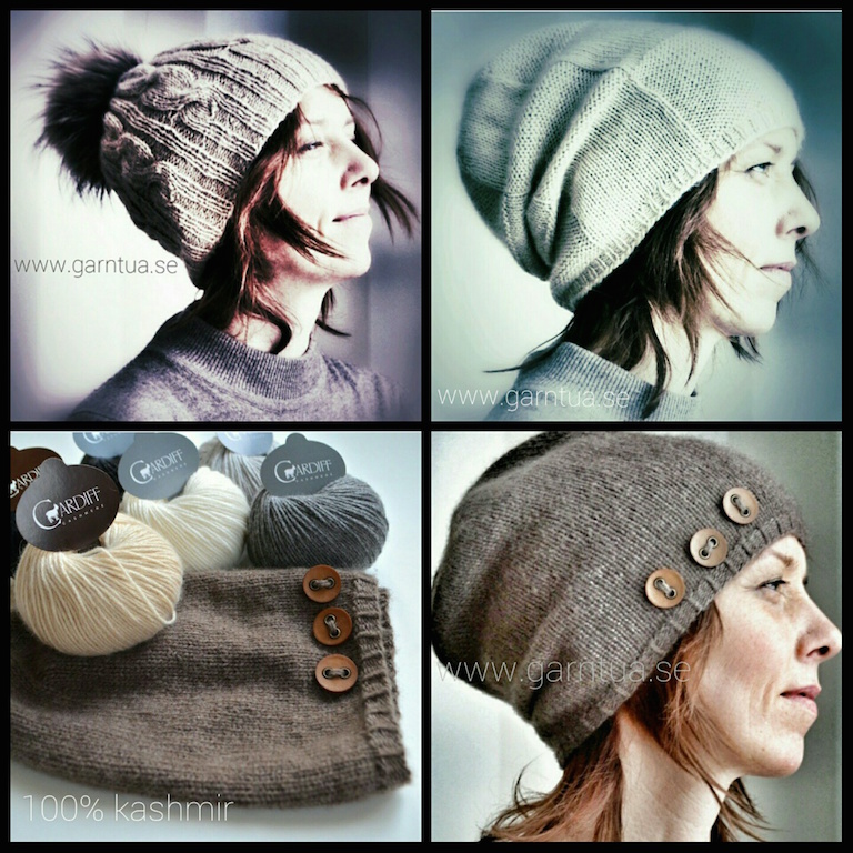 Detta är en collage från Instagram med bilder på mina cashmeremössor. Den med knapparna är den mest populära. Den sitter ganska löst och klämmer inte åt runt pannan, det är ganska smickrande för de flesta.