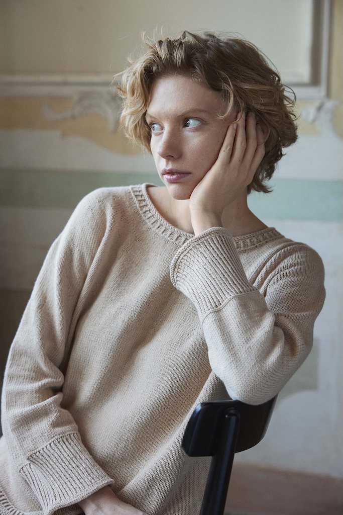 Beskrivning till tröja med runt ok i 100% ekologisk bomull. Det mjuka och långfibriga Langyarns Baby Cotton. Tröjan är stickat ovanifrån och ned på rundsticka.